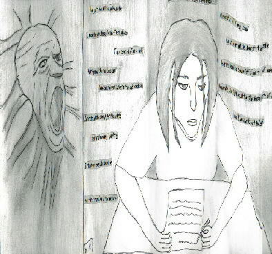 This is a picutre of a girl I drew where she's writing hate poem, and the thing written on the wall is as if she wrote that poem too. Poem reads : Part of me won't go away Everyday reminded how much I hate it Weighted against the consequences Can't live without it so it's senseless Wanna cut it out of my soul And just live with a gaping hole Take control of my life And wash out all the burnt taste I made the problems in the first place Hang my head low 'cause it's part of me Ya hardly see right next to the heart of me Heard of me the routine scar New cuts cover where the old ones are And now I'm sick of this I can't stand the sandpaper thoughts that grade away on my sanity I rather not even be then the man that's staring in the mirror through me. |